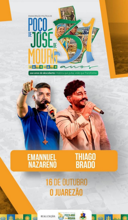 Encerrando a programação alusiva aos 31 anos de emancipação política de Poço de José de Moura, a Prefeitura promoverá, nesta quinta-feira (16 de outubro), uma noite especial de fé, louvor e adoração, marcando o encerramento das comemorações que movimentaram o município desde o início do mês.