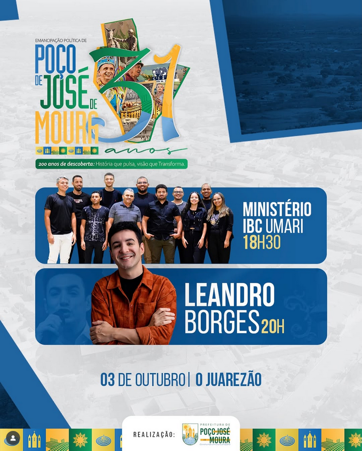 02/10/2025 - 15:26h - NotíciasO município de Poço de José de Moura dará início, nesta sexta-feira, 03 de outubro de 2025, às comemorações pelos seus 31 anos de emancipação política. A programação contará com momentos de fé, música e cultura, reunindo a população poçomourense no tradicional Juarezão.