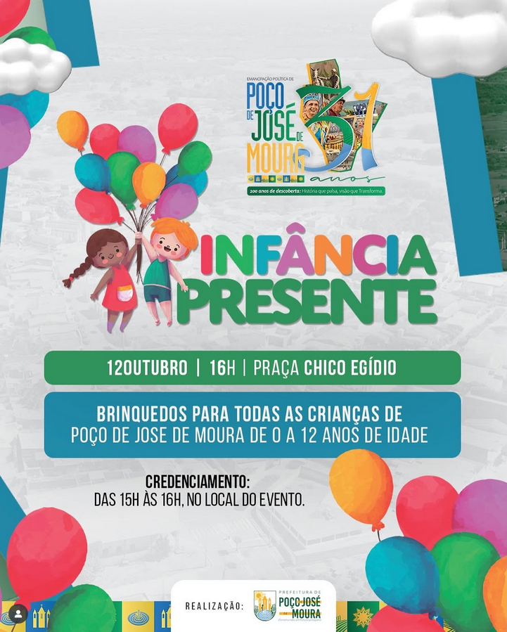 10/10/2025 - 14:49h - NotíciasA Prefeitura de Poço de José de Moura promove neste domingo (12) o evento “Infância Presente”, em comemoração ao Dia das Crianças. A programação começa às 16h, na Praça Chico Egídio, dentro das ações pelos 31 anos de emancipação política do município.
